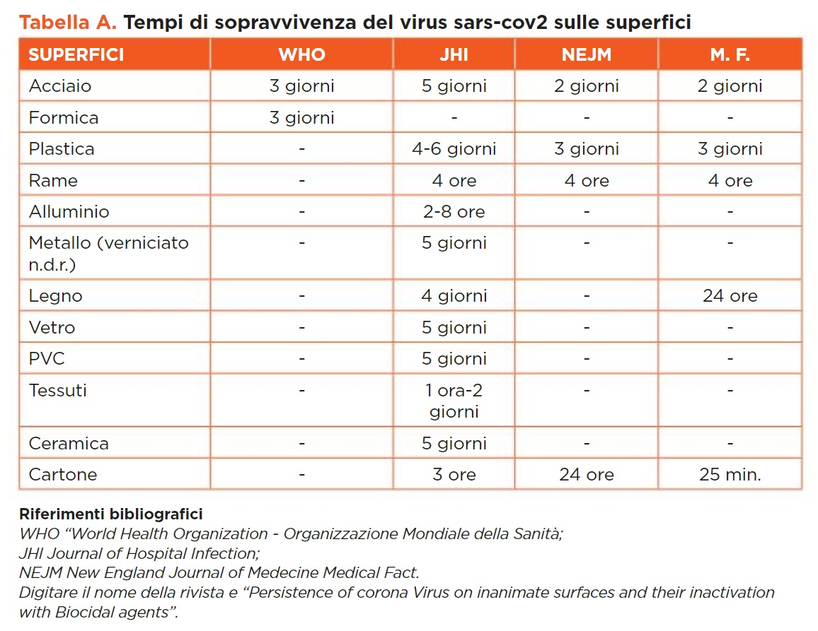 As highlighted in table A on some surfaces of common use, the survival of Covid-19 is quite long-lasting, making it necessary to intervene with correct cleaning and sanitizing practices.